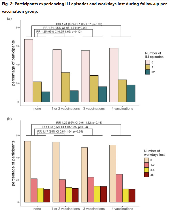 August 9 – A study is published in Nature’s Communications Medicine titled, “Association of SARS-CoV-2 vaccination status with risk of influenza-like illness and loss of workdays in healthcare workers.” To analyze the health outcomes of 1,745 Swiss healthcare workers, researchers collected weekly data on symptoms and sick days taken “during a period of high SARS-CoV-2 community transmission (November 2023 to May 2024)” and found what has been shown in seven other studies – “more SARS-CoV-2 vaccinations are associated with a higher risk of influenza-like respiratory illness and workdays lost. For influenza-like respiratory illness, the association is stronger with a more recent timing of the vaccination rather than the number of vaccinations, which suggests that the effect wanes over time.” To be specific, those who received three jabs had a 56% higher chance of contracting an influenza-like illness compared to the unvaccinated, while those who took four had a 70% higher chance. The “plain language summary” section of the study reads in part, “it is still unclear whether annual COVID booster vaccines are necessary for low-risk populations such as healthcare workers. In this study, 1745 healthcare workers in Switzerland were followed over several months to see how their vaccination status affected their chances of getting flu-like illnesses and missing work. The study found that those who recently received a COVID-19 booster were more likely to report symptoms and take sick leave… These findings suggest that COVID-19 boosters may not offer clear short-term benefits in a post-pandemic setting, and may even increase short-term illness risk. This raises questions about the best use of booster vaccines moving forward.”