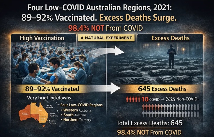 “Across these four regions in 2021, [t]otal excess deaths [were] 645 [and] total deaths classified as ‘from or with COVID’ [were] 10. That means 635 of 645 excess deaths – 98.4% – were not attributed to COVID. In these four regions in 2021: COVID-19 mortality declined. Lockdowns were brief and limited. Vaccination rates exceeded 89% in every region. Excess mortality rose sharply. When high COVID burden and prolonged lockdown confounders are removed, what remains is mass vaccination. In these four regions, the sequence is unmistakable: rapid, near-universal vaccine rollout followed by a measurable spike in excess deaths.” The study’s author, Raphael Lataster concluded, “[c]ombined with increasing evidence that the efficacy/effectiveness and safety of COVID-19 vaccines have been greatly exaggerated, including acknowledgements from the Australian and American governments that several deaths have been caused by the vaccines, these findings make it a near-certainty that COVID-19 vaccines have been – and continue to be – contributing to excess mortality.” Also see this.