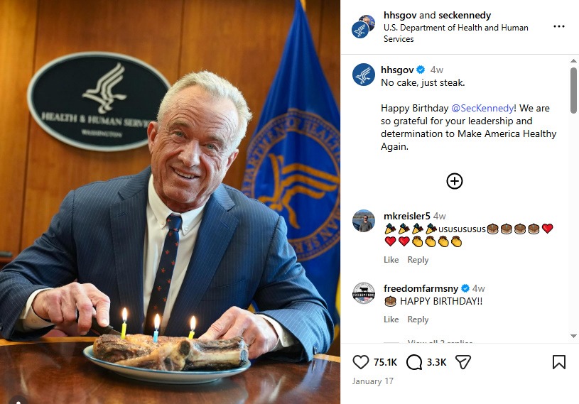 January 23 – The killjoys over at Health Digest publish an article titled, “RFK Jr.’s Bizarre ‘Cake’ For 72nd Birthday Highlights The Drawbacks Of His Extreme Diet” – nearly a week after his birthday! Author Amanda Ray Byerly wrote in part, “It’s no secret that United States Secretary of Health and Human Services Robert F. Kennedy Jr. adheres to a strict diet… Alas, it appears that the protein aficionado affords himself very little wiggle room when it comes to eating clean – even on his birthday. On January 17, 2026, the federal agency took to their official Instagram and Twitter accounts to wish Kennedy a happy 72nd birthday, albeit with a notably bizarre choice of birthday dessert. ‘No cake, just steak,’ the post’s caption read, along with a photo of the birthday boy grinning ear to ear while posing with a sizeable steak adorned with birthday candles…