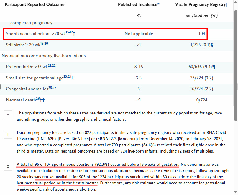 Update (9/8/2021): The New England Journal of Medicine publishes a “correction” to explain away this horrifying data, but the excuses they make – in addition to being presented poorly and difficult to read – were not very comforting or convincing. For example, the double dagger symbol in the spontaneous abortion row of one of the study’s charts leads you to text which reads in part (screenshot below), “A total of 96 of 104 spontaneous abortions (92.3%) occurred before 13 weeks of gestation. No denominator was available to calculate a risk estimate for spontaneous abortions, because at the time of this report, follow-up through 20 weeks was not yet available for 905 of the 1224 participants vaccinated within 30 days before the first day of the last menstrual period or in the first trimester.” The “correction” page says this information “should have been appended to the double dagger,” but yet it is there now when you link to the original study… So how would we know if the original data ended up being altered in some way to achieve a better result? That aside, 96 “spontaneous abortions” occurring in “1224 participants vaccinated within 30 days before the first day of the last menstrual period or in the first trimester” is still 7.84% – which is still very concerning (and definitely not “safe and effective”). Moreover, why is tallying the number of spontaneous abortions (a pregnancy lost within the first 20 weeks) considered a “risk estimate” when it is the actual rate at which they occurred? Update 2 (4/10/25): Senator Ron Johnson (R-WI) accuses Tom Shimabukuro, the CDC doctor in charge of monitoring adverse reactions to the COVID vaccine, of mishandling or even deleting key records from the 2021 NEJM study. In a letter written to Attorney General Pam Bondi, FBI Director Kash Patel, and HHS watchdog Juliet Hodgkins, Johnson wrote in part, “HHS officials recently informed me that Dr. Shimabukuro’s records remain lost and, potentially, removed from HHS’s email system altogether.” Any way you slice it, the COVID saga always seems to go from bad to worse…