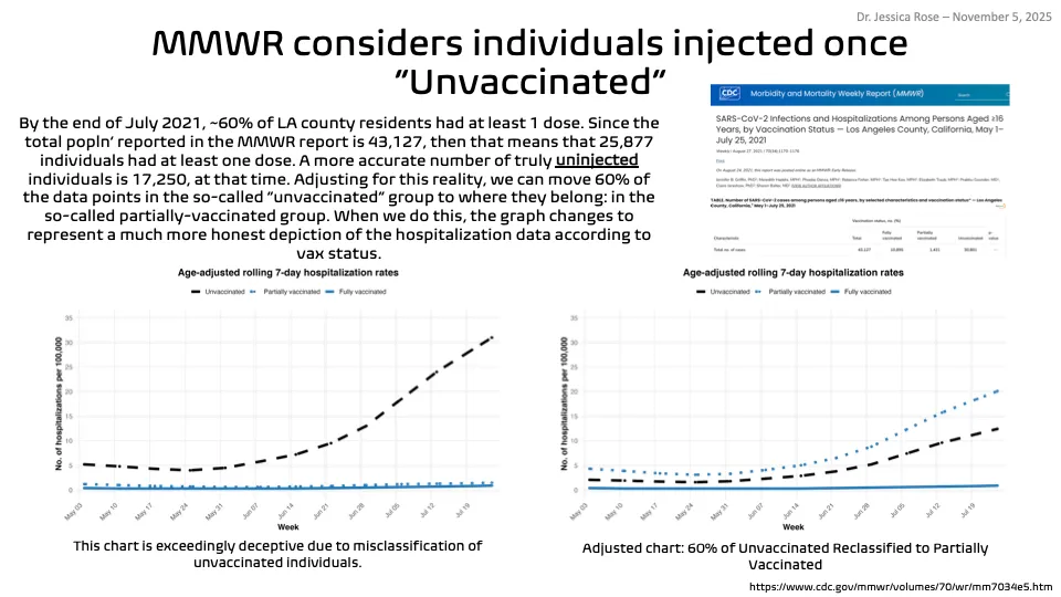 November 5 – Jessica Rose publishes an article at her Substack titled, “Misclassification of individuals as ‘unvaccinated’ using antibody jargon to mislead the public.” The piece not only explains how the scam works, but Rose provides readers with numbers and charts to more accurately reflect who was being hospitalized for COVID and when. Spoiler alert: In 2021, it was the “vaccinated” and “partially vaccinated” being hospitalized at a higher rate.