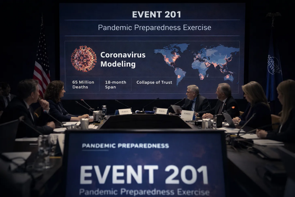 October 18, 2019 – “Event 201” gets underway in New York City with the head of the Chinese CDC present for the exercise. Here is a breakdown of the other “players” who participated, including links to learn about who they are (a pack of globalists). From the official Event 201 website homepage: “The Johns Hopkins Center for Health Security in partnership with the World Economic Forum and the Bill and Melinda Gates Foundation hosted Event 201, a high-level pandemic exercise on October 18, 2019, in New York, NY. The exercise illustrated areas where public/private partnerships will be necessary during the response to a severe pandemic in order to diminish large-scale economic and societal consequences.” From the official “Event 201 Scenario” page: “Event 201 simulates an outbreak of a novel zoonotic coronavirus transmitted from bats to pigs to people that eventually becomes efficiently transmissible from person to person, leading to a severe pandemic. The pathogen and the disease it causes are modeled largely on SARS, but it is more transmissible in the community setting by people with mild symptoms.” Just like COVID.